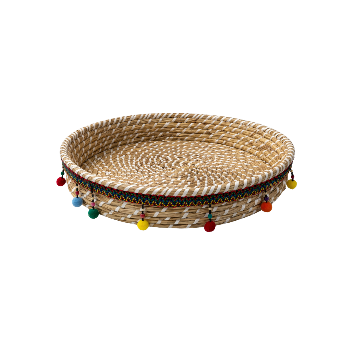 Canasta Mimbre Redonda con Borlas Coloridas 18″